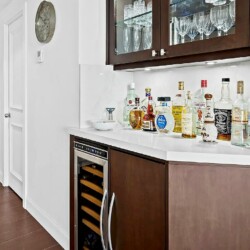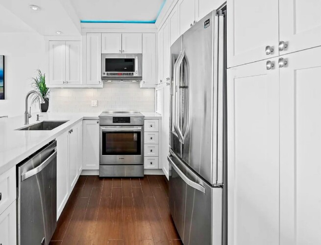 The gourmet kitchen is appointed with custom wood cabinetry, Silestone countertops, and a sleek electric cooktop and oven, complemented by modern appliances suited for both short stays and extended visits. The bedroom serves as a quiet retreat, supported by one full bathroom and an additional half bath to enhance privacy and convenience.