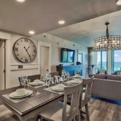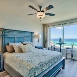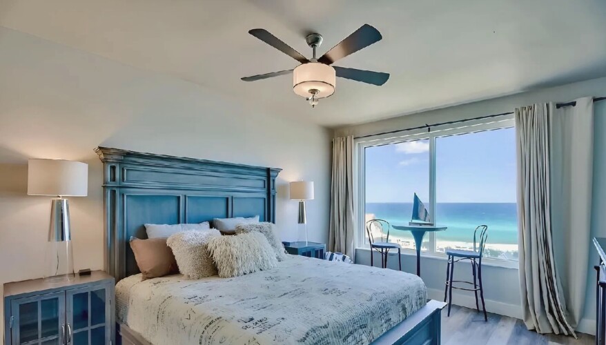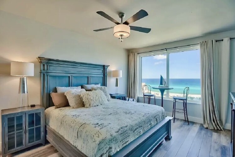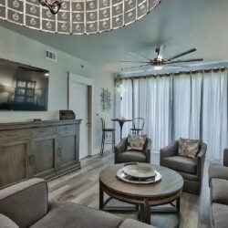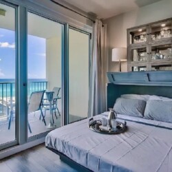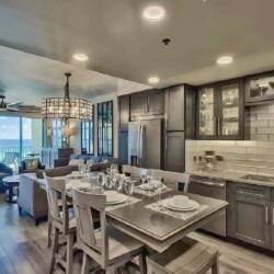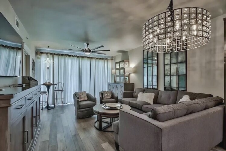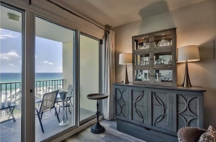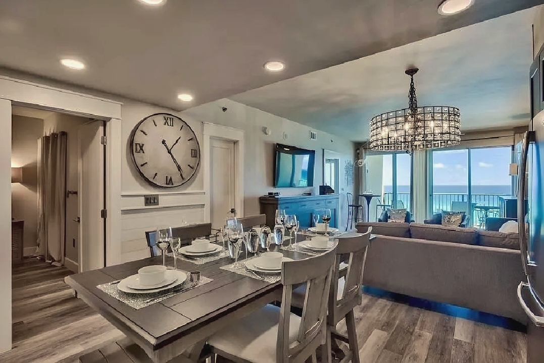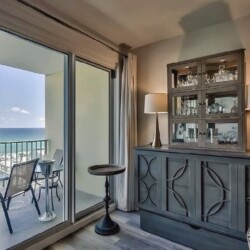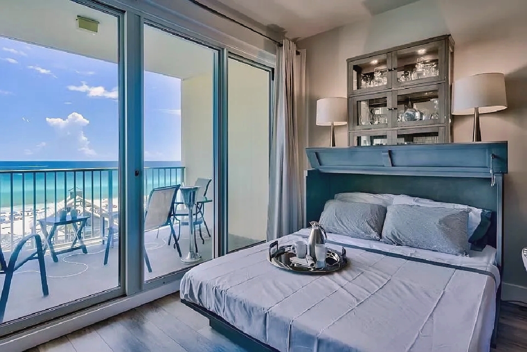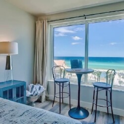 An open living space with comfortable furnishings, a fully equipped kitchen, and a private balcony that frames sweeping Gulf views creates a peaceful coastal atmosphere ideal for unwinding; guests can enjoy modern amenities along with immediate access to white sand beaches, nearby dining, shops, and local attractions, making it a convenient and inviting retreat for couples or small families seeking a serene Miramar Beach getaway.