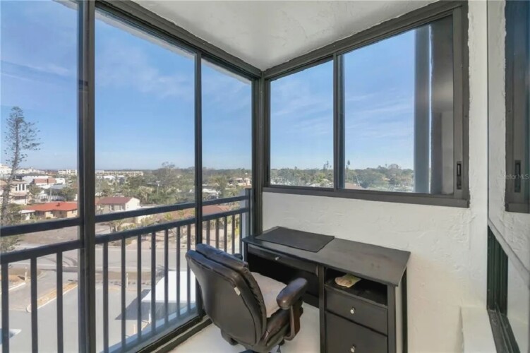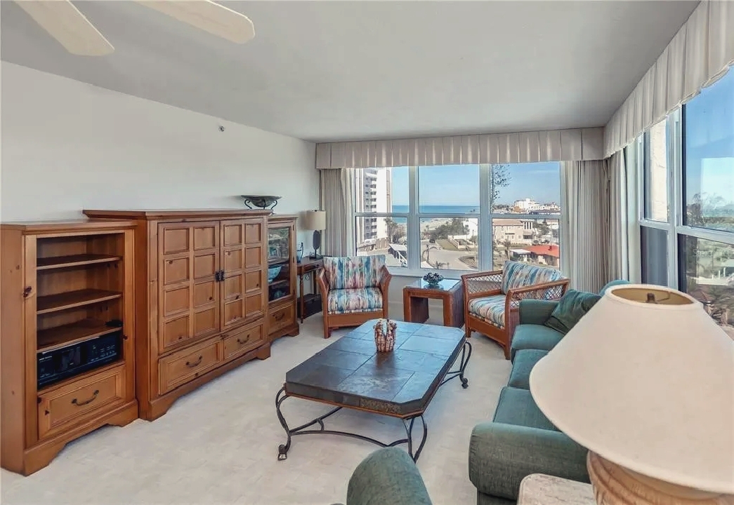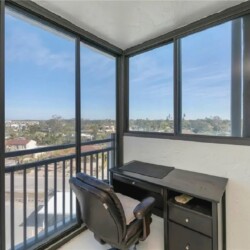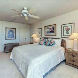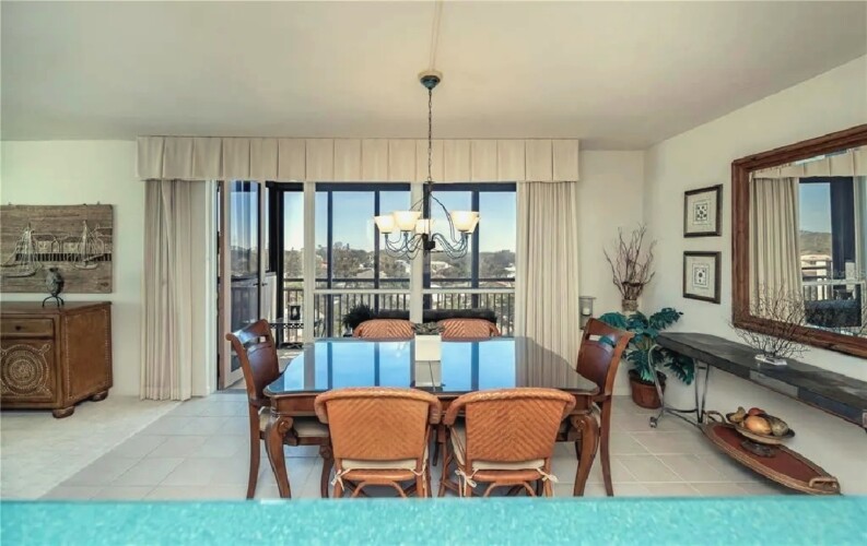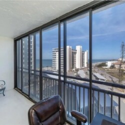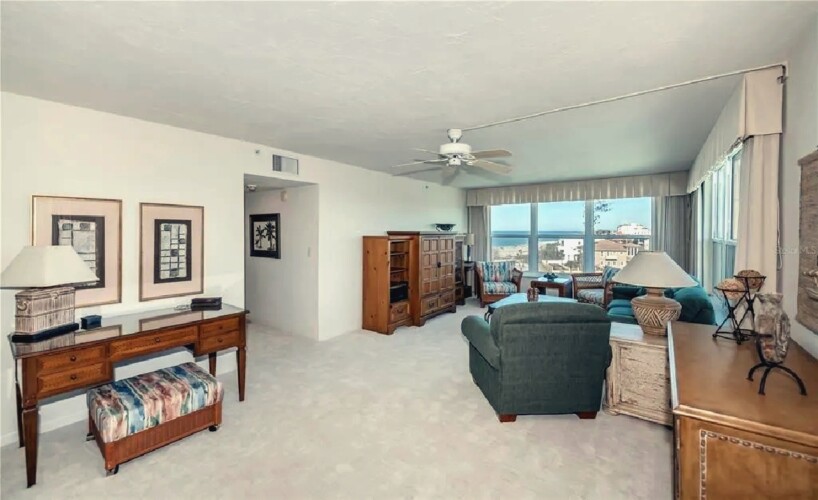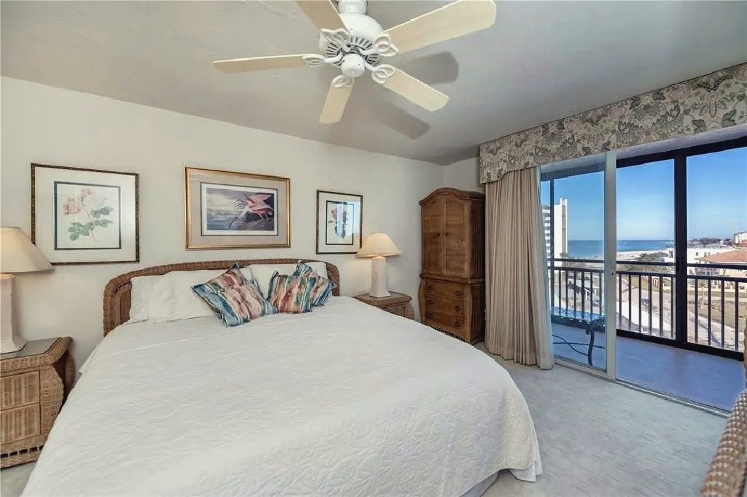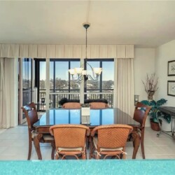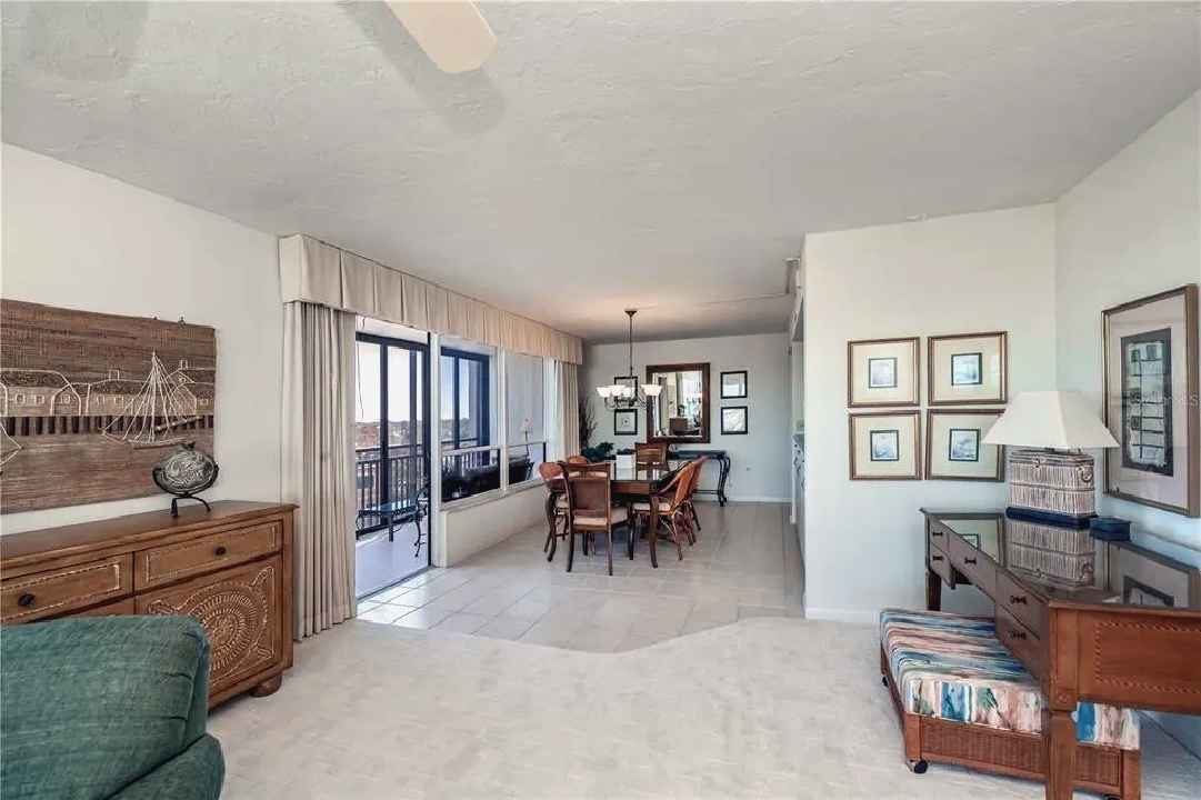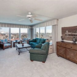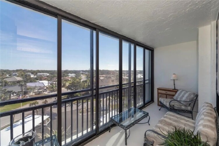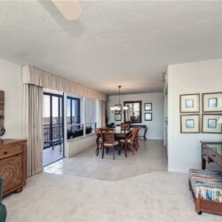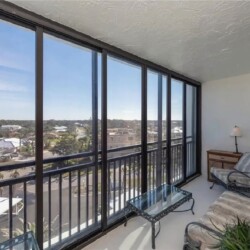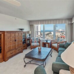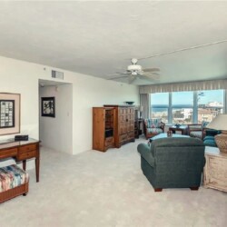 A spacious living area with comfortable furnishings, a fully equipped kitchen, and a private balcony offering pleasant scenic views create a relaxing setting for a coastal stay; guests can enjoy a convenient location just a short drive from Venice’s beaches, dining, and local attractions, making it an inviting choice for families or friends seeking a comfortable and well-situated getaway.