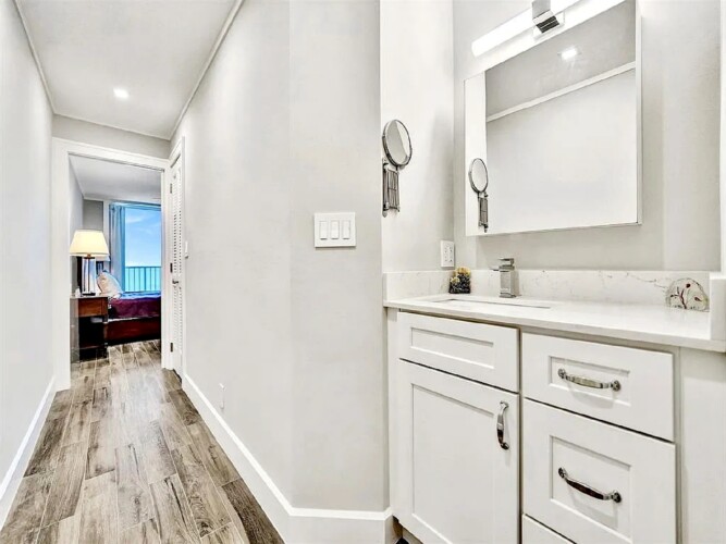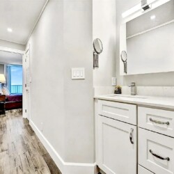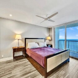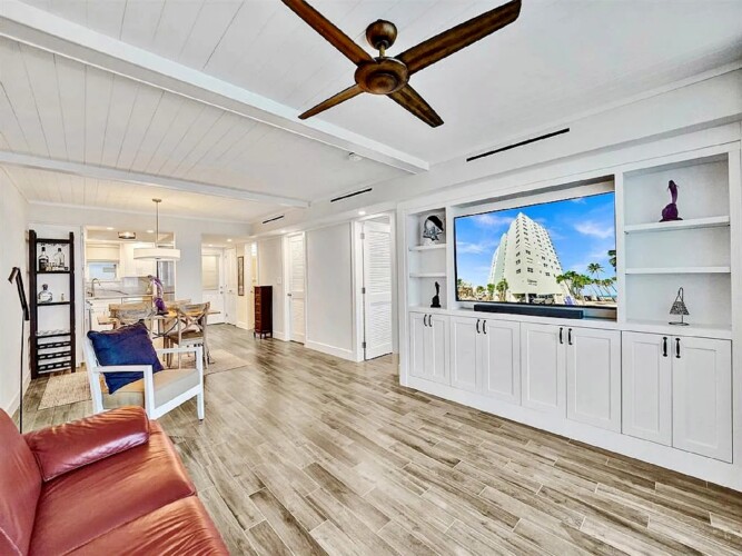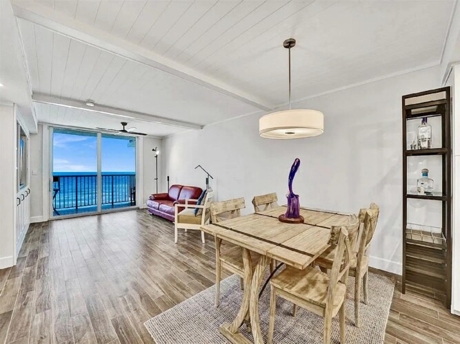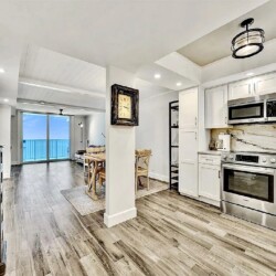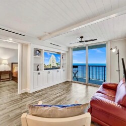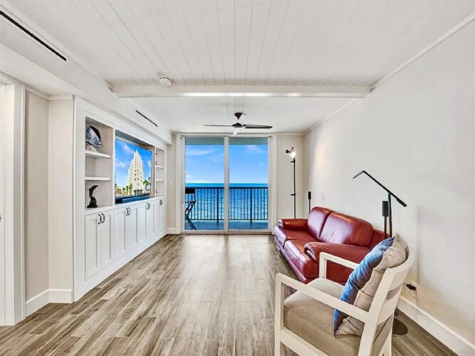 Spanning approximately 820 square feet, the thoughtfully updated interior blends modern finishes with relaxed coastal elegance. The bright living space opens to a private balcony overlooking the ocean and Broadwalk, creating the perfect setting to enjoy sunrise views and the rhythm of the shoreline. Impact glass sliding doors enhance both natural light and storm protection.