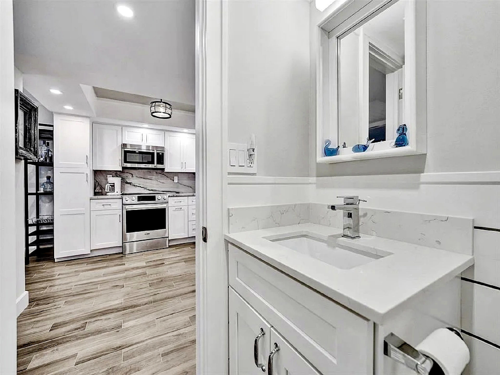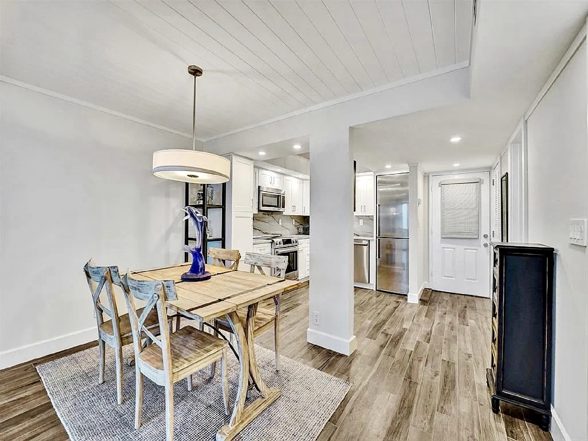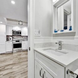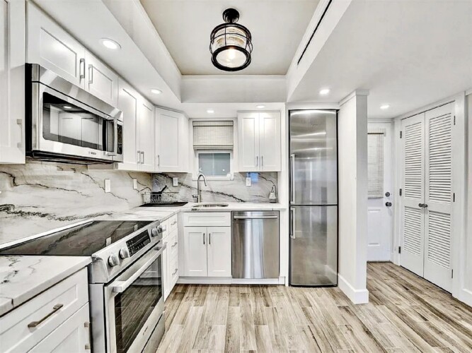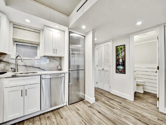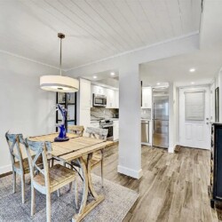 The updated kitchen features contemporary cabinetry, quartz countertops, and stainless steel appliances suited for both short visits and extended stays. In addition to the primary bedroom, the residence includes a bonus room/den that provides flexibility for guests or additional living space. One full bathroom and an additional half bath enhance everyday comfort and privacy.