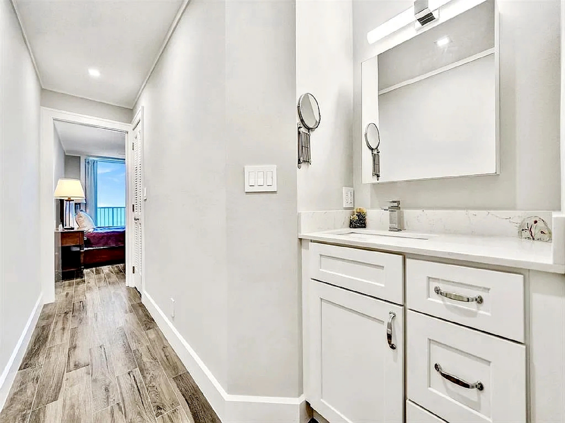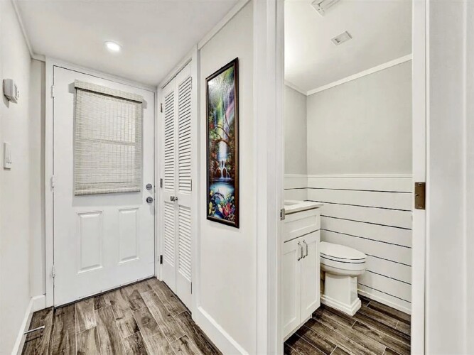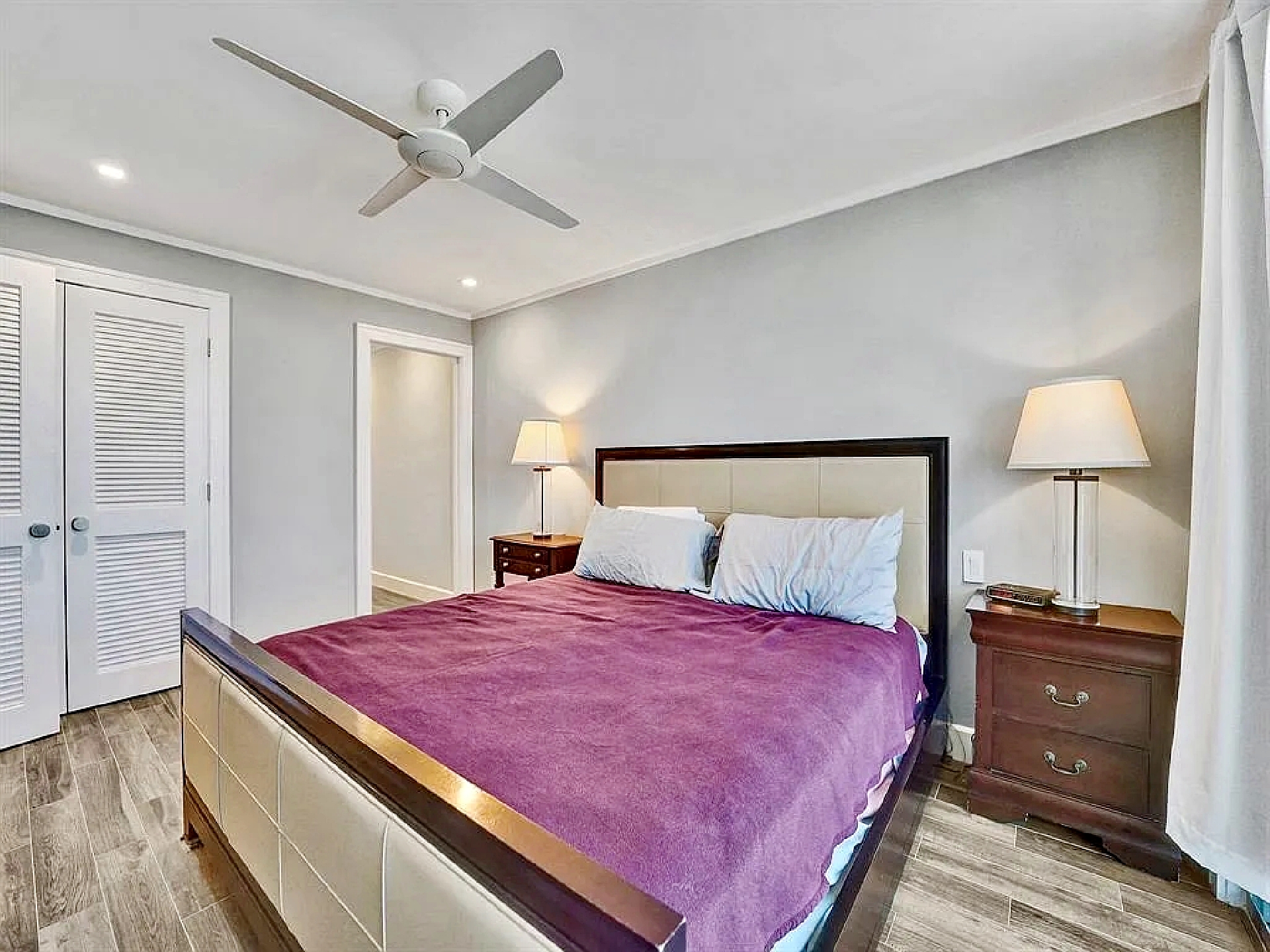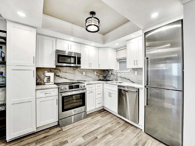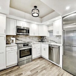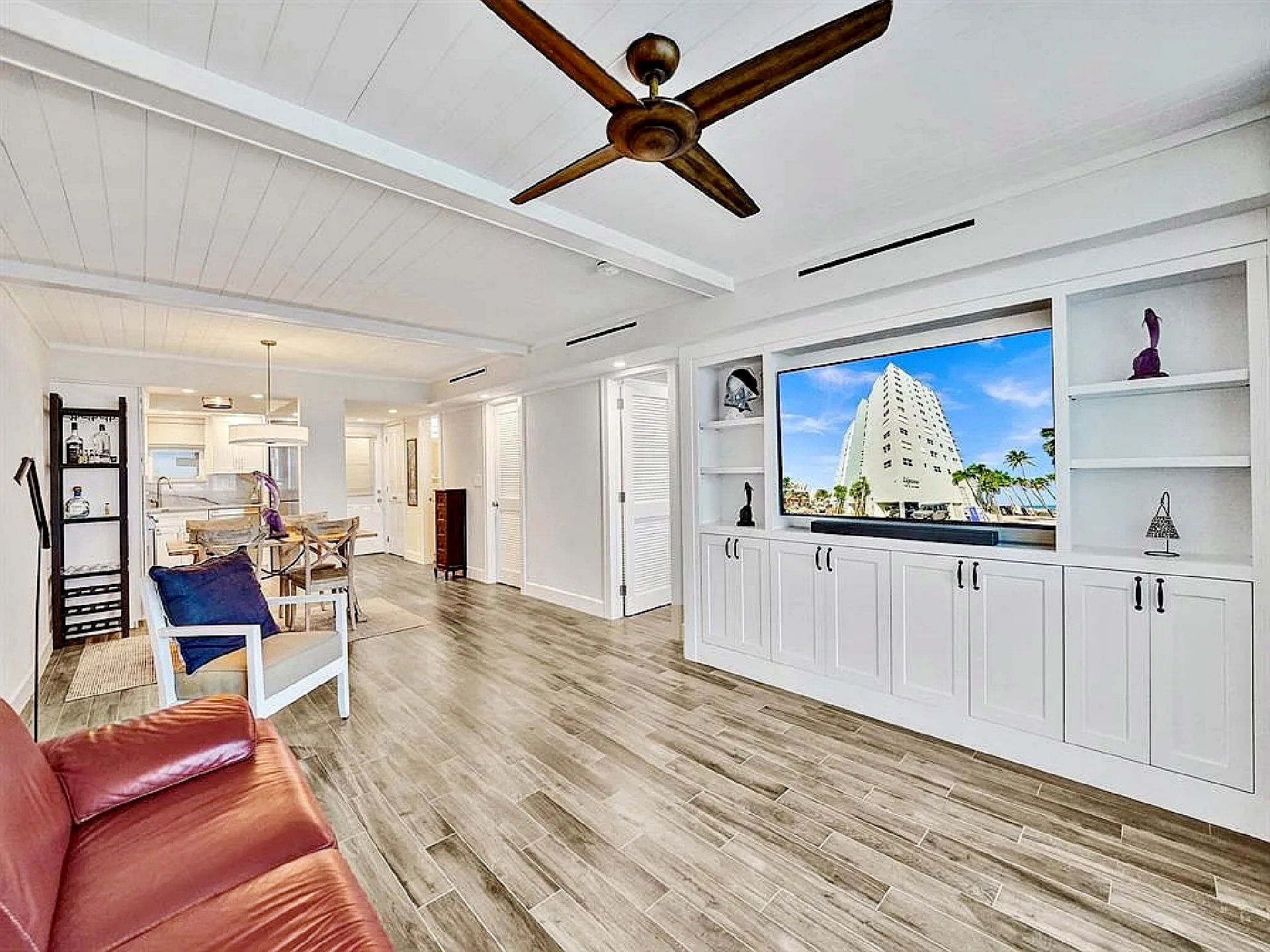 The updated kitchen features contemporary cabinetry, quartz countertops, and stainless steel appliances suited for both short visits and extended stays. In addition to the primary bedroom, the residence includes a bonus room/den that provides flexibility for guests or additional living space. One full bathroom and an additional half bath enhance everyday comfort and privacy.