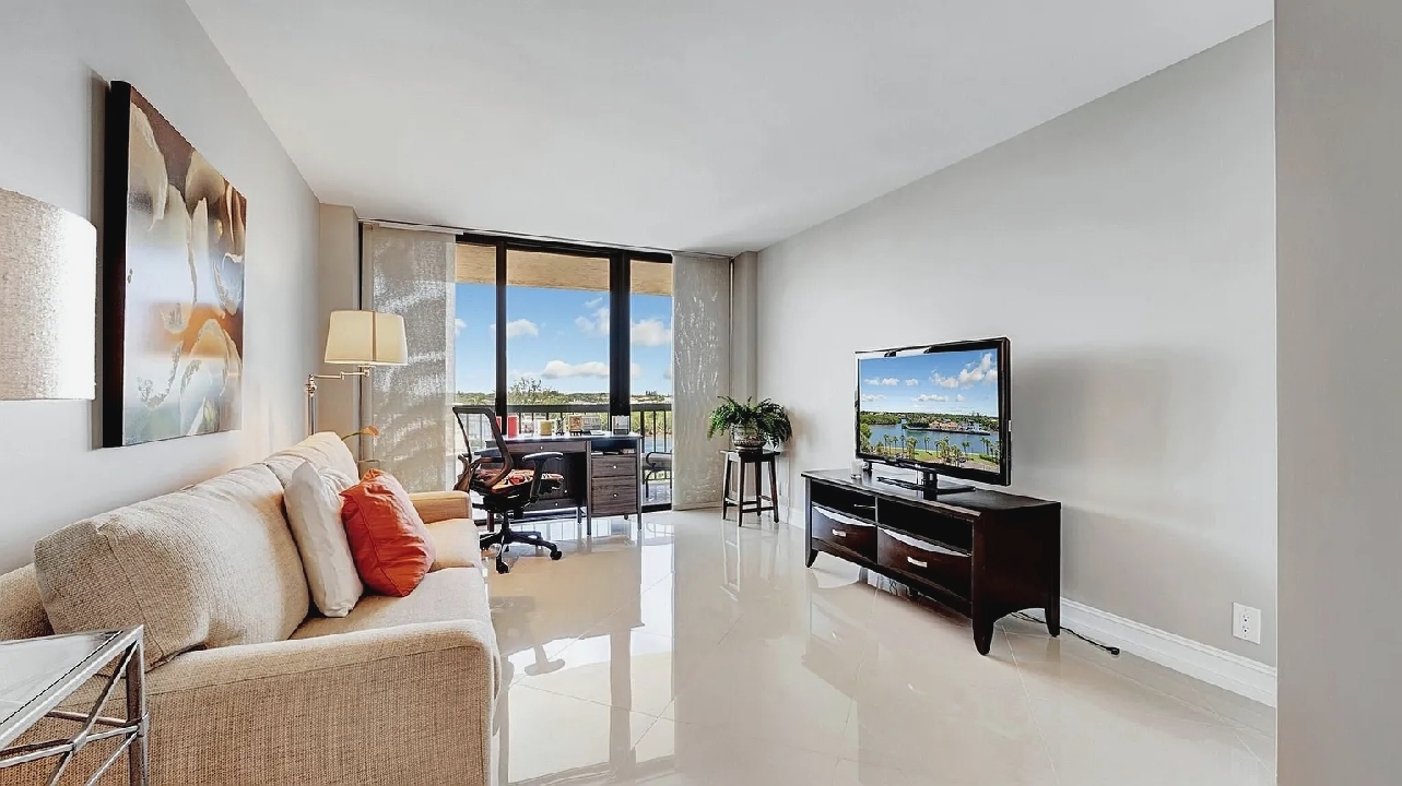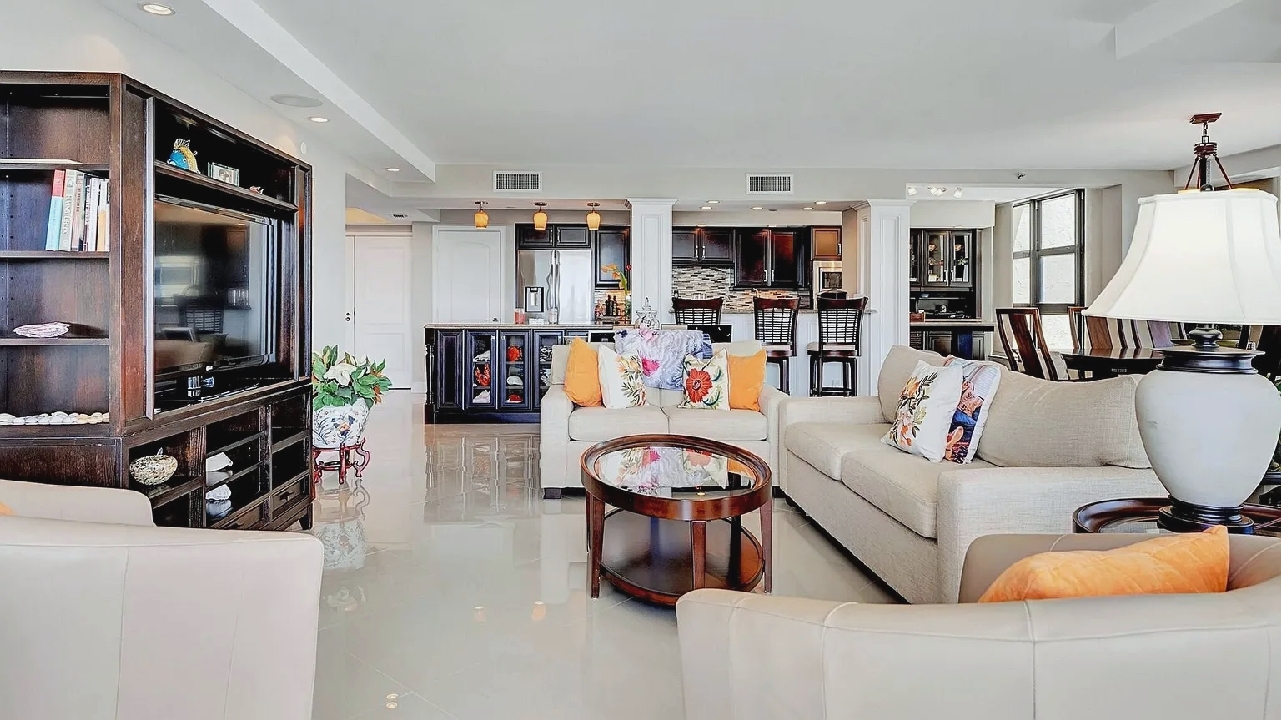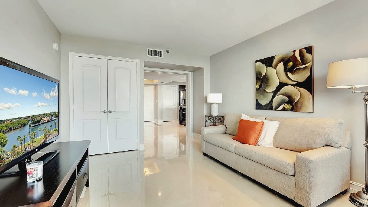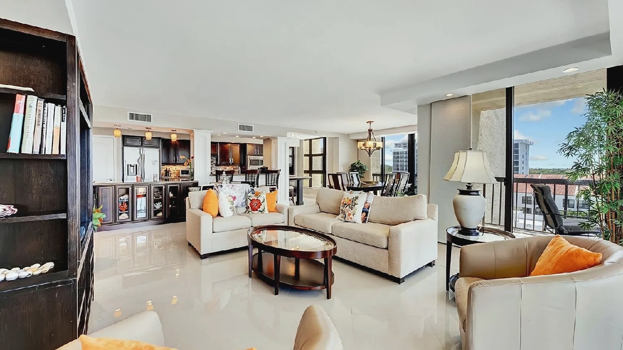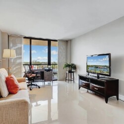 Bright open living areas with comfortable furnishings, a modern well-equipped kitchen, and a private balcony showcasing wide ocean views create a relaxing beachfront setting suited for quiet mornings or sunset gatherings; guests can enjoy amenities such as a heated pool, fitness center, and direct beach access, along with convenient proximity to nearby cafes, restaurants, shops, and local attractions, making it an inviting retreat for couples, families, or small groups seeking a refined coastal escape in Highland Beach.