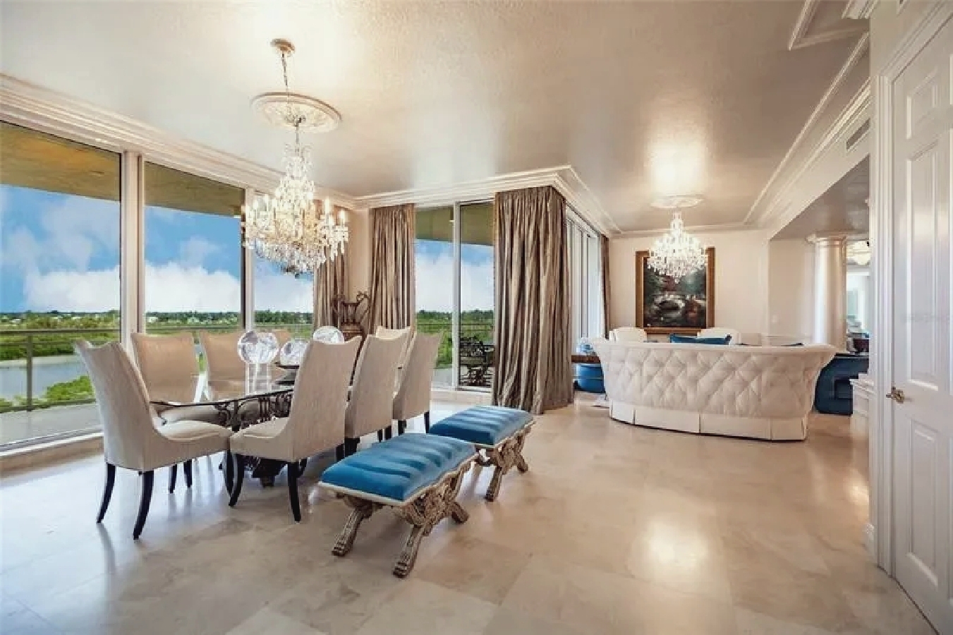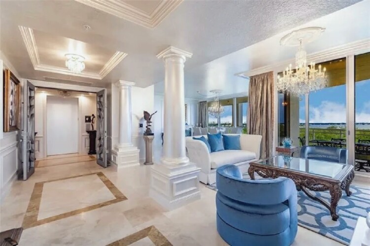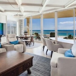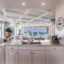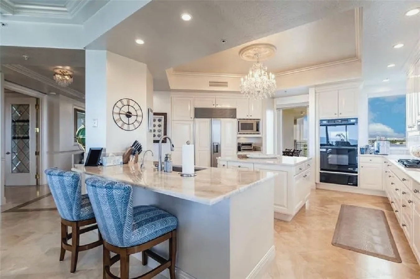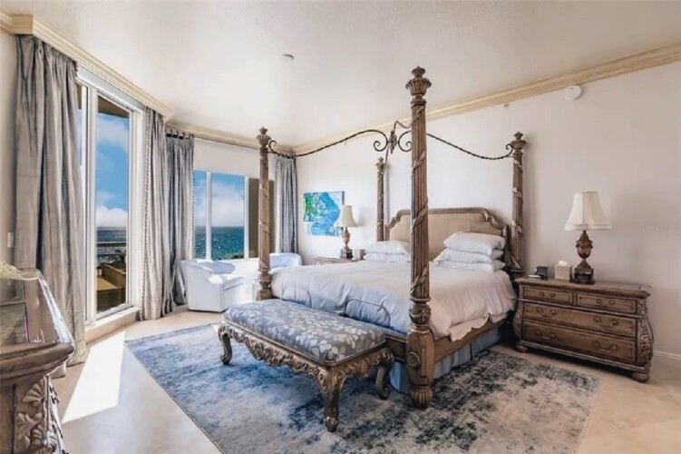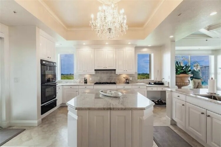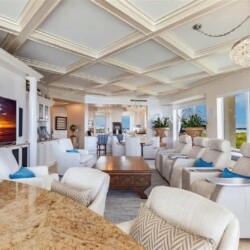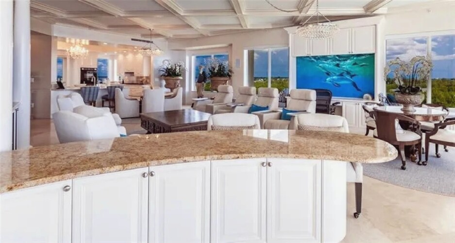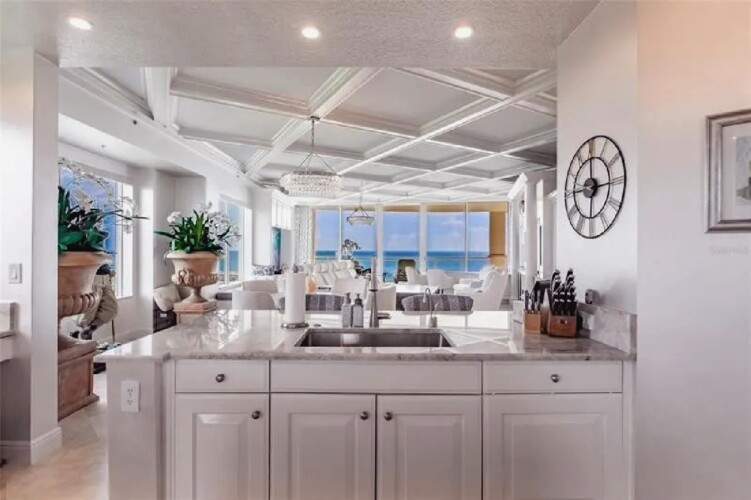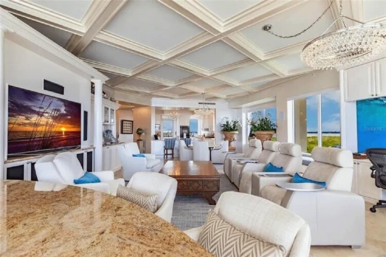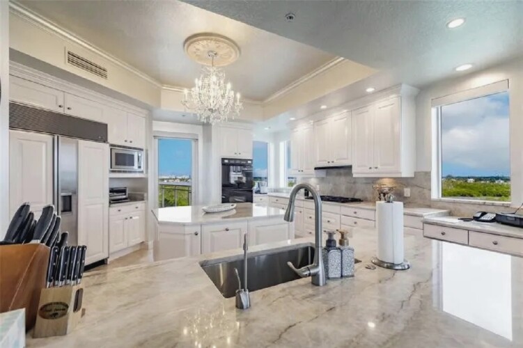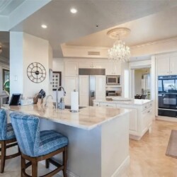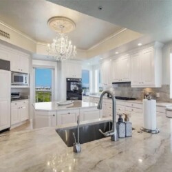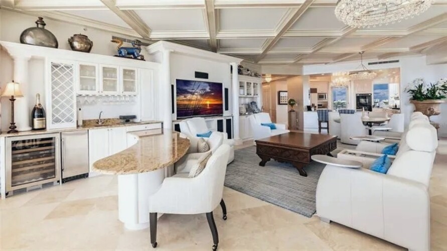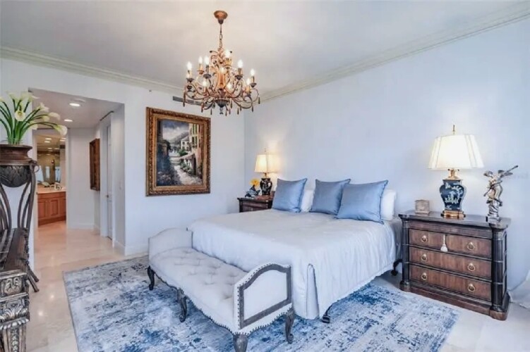 This expansive three-bedroom luxury apartment offers refined coastal living with spacious open-concept interiors, marble and travertine flooring, and sophisticated designer finishes throughout. Multiple living areas provide ample room for relaxation and entertaining, while the gourmet kitchen features premium appliances and stone countertops for an elevated culinary experience. The impressive primary suite includes a spa-inspired bathroom and a generous walk-in closet, complemented by high ceilings, crown molding, and smart home technology for modern comfort. Additional highlights include an in-unit elevator, wet bar, and energy-efficient windows. Perfect for guests seeking a stylish, comfortable, and luxurious coastal retreat in Sarasota.