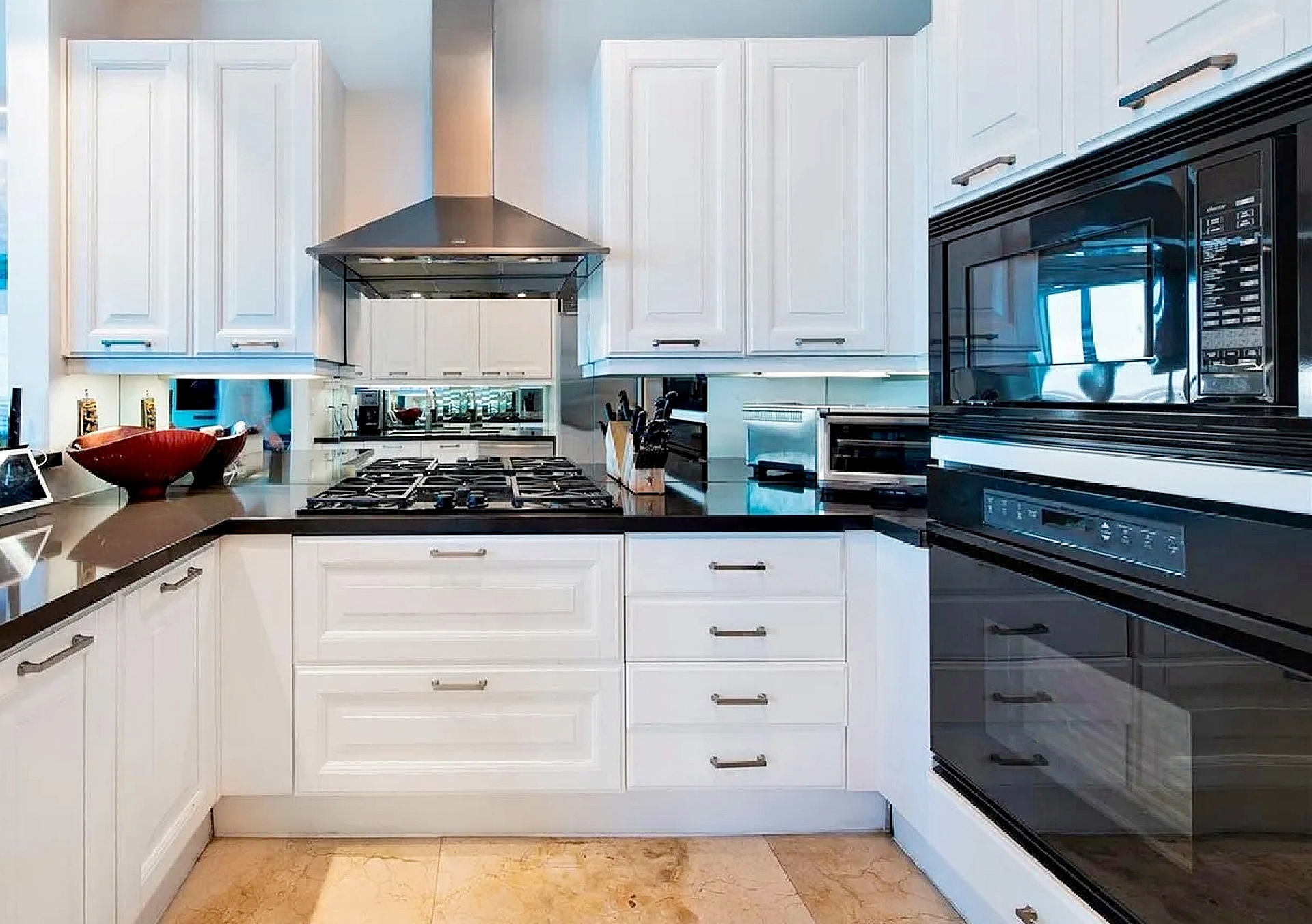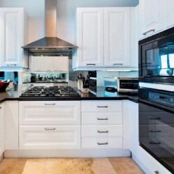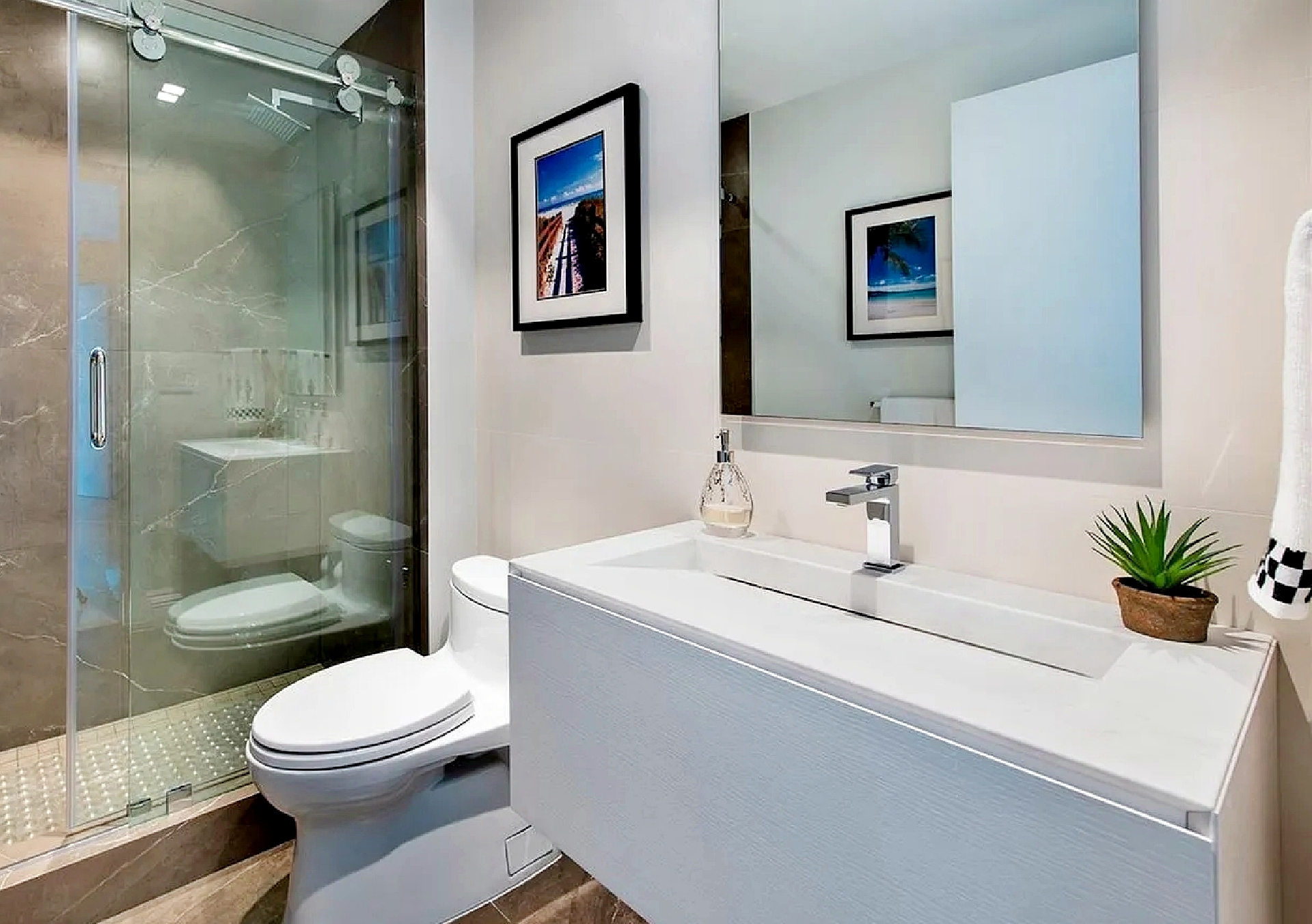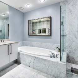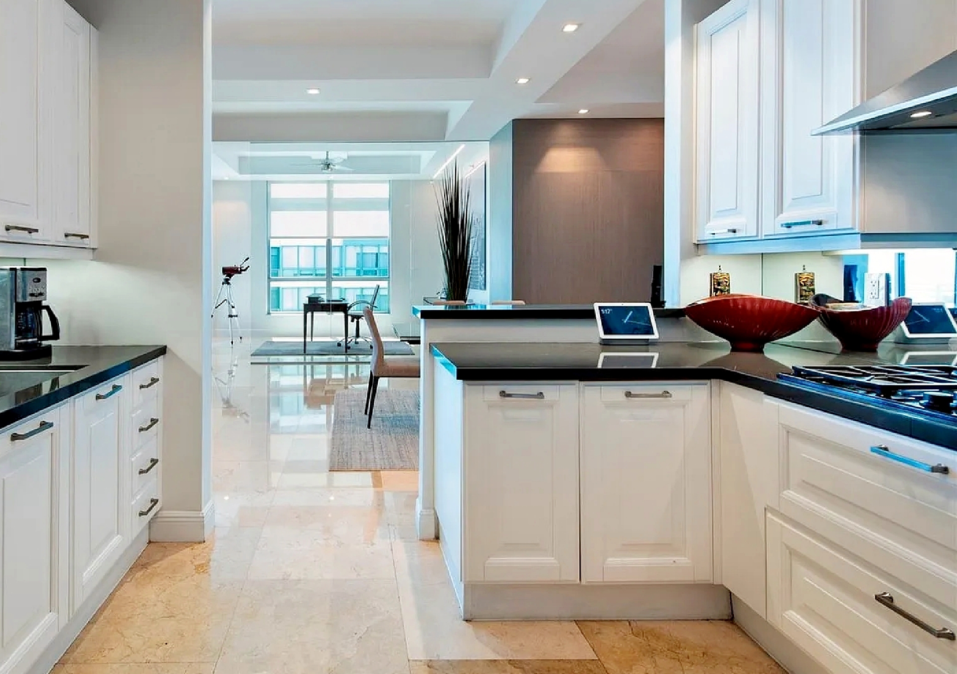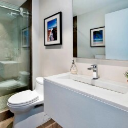 The open-concept kitchen features Italian cabinetry, Sub-Zero refrigeration, a gas range, Miele dishwasher, and premium finishes designed for both everyday comfort and entertaining. Two spacious bedroom suites each offer en-suite bathrooms, complemented by an additional powder room for guests. Custom closets, marble flooring, and motorized window treatments enhance the elevated interior design.