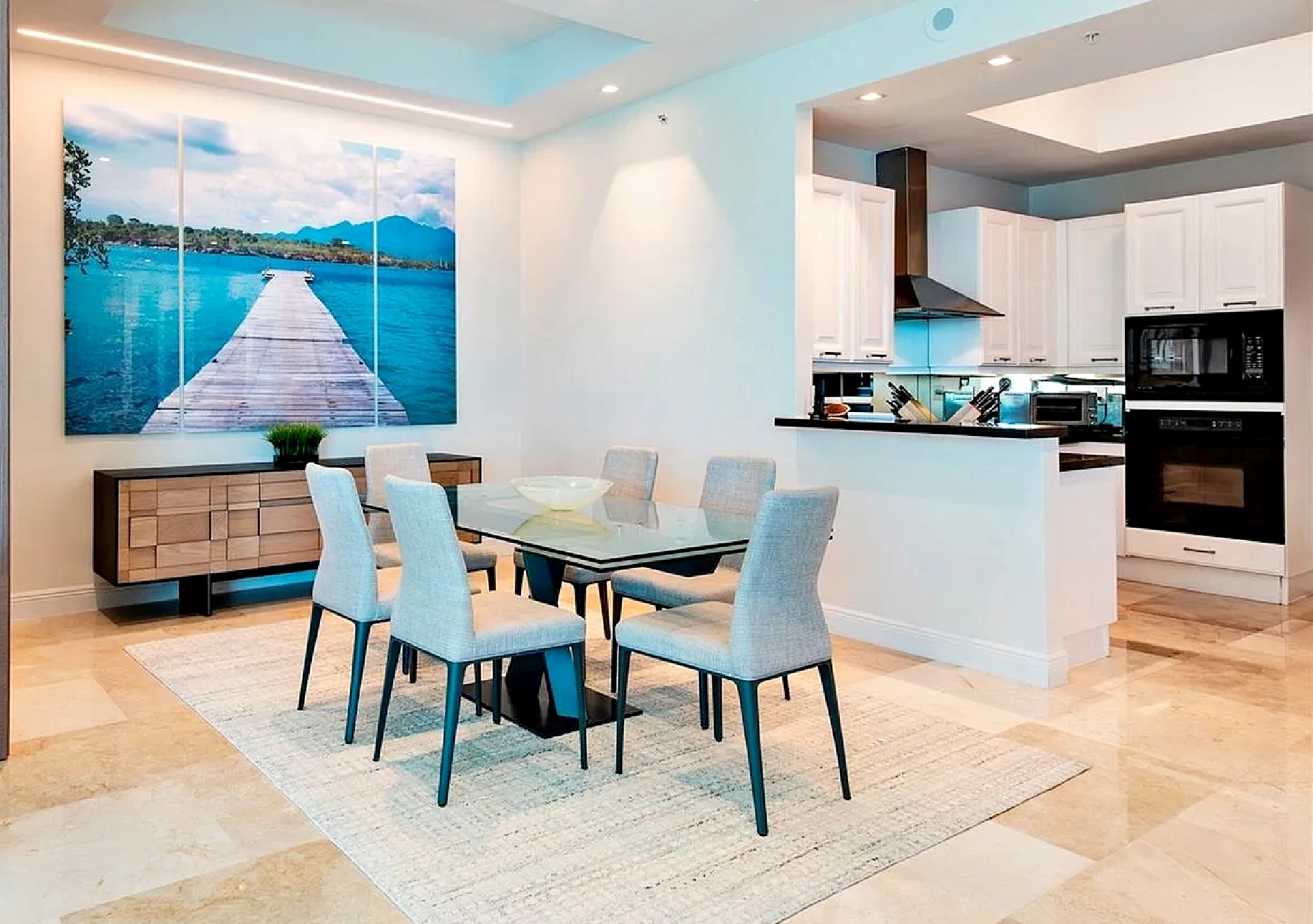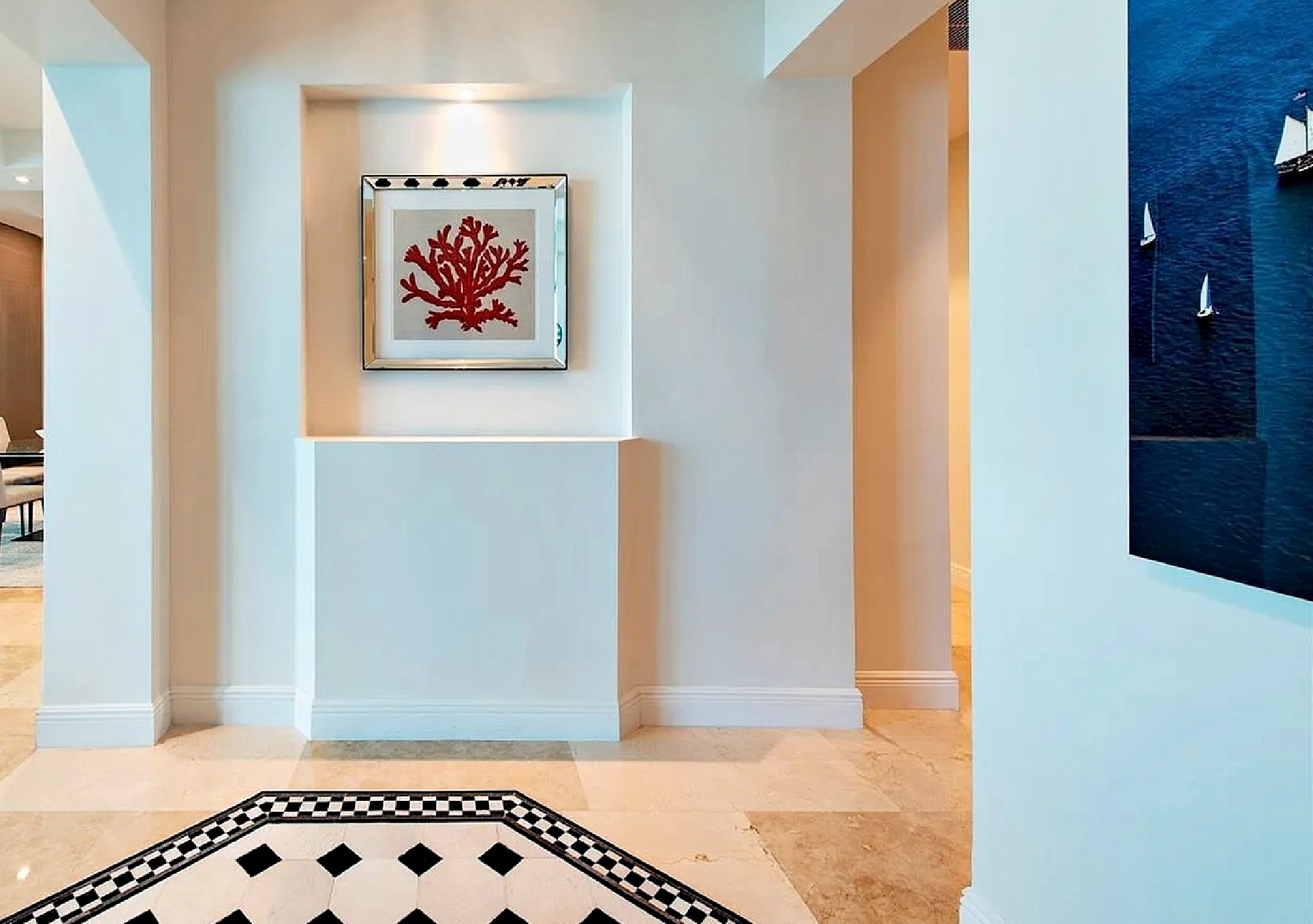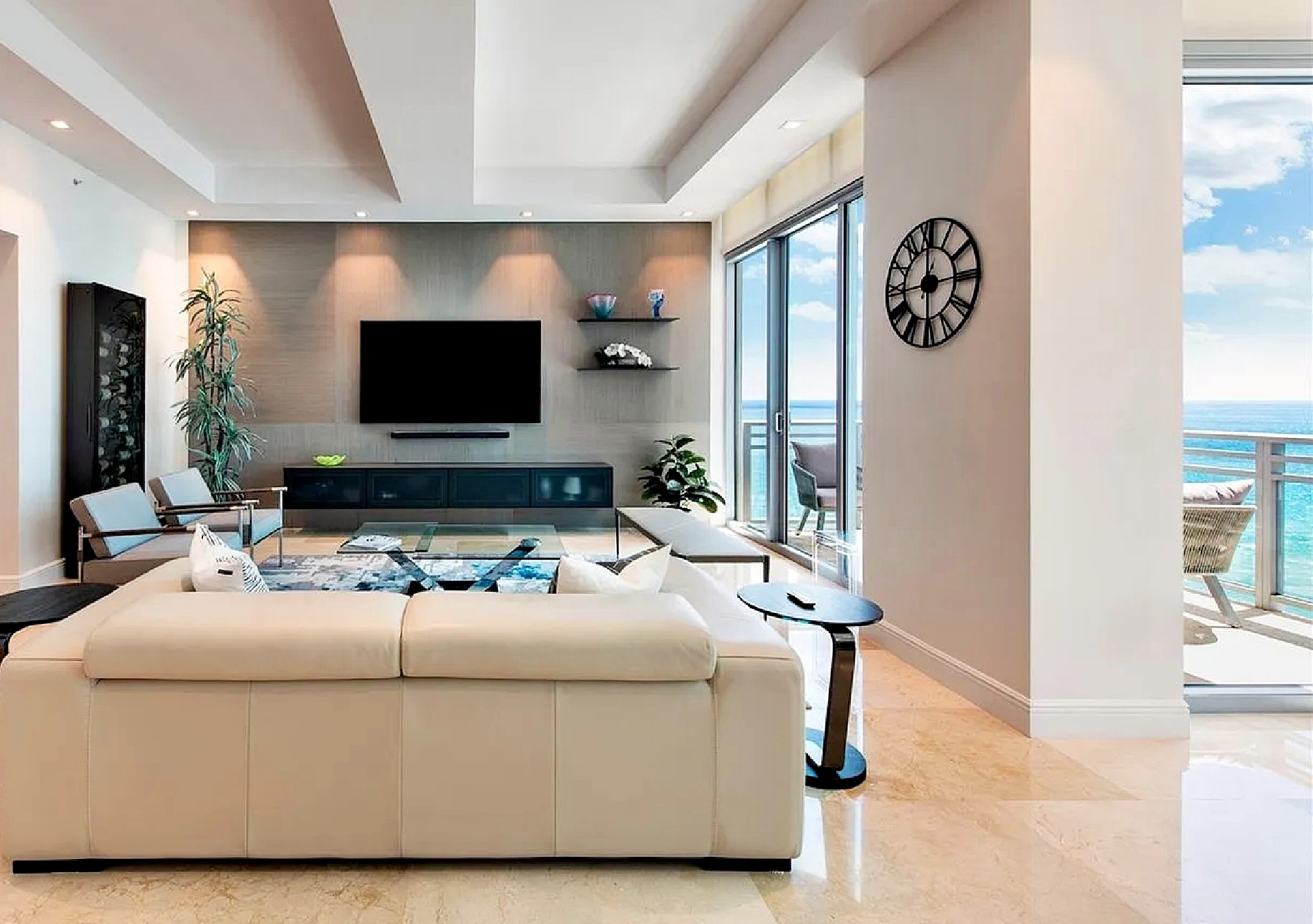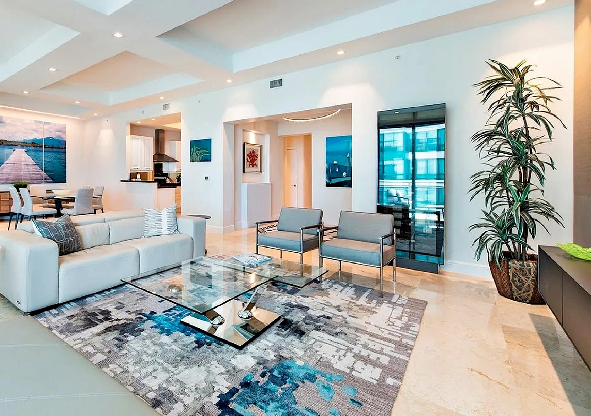 Accessed via private elevator entry, the residence opens into a grand foyer with soaring 11-foot ceilings and an elegant flow-through layout that captures natural light and panoramic water views from multiple rooms. The extended living and dining areas are framed by expansive impact glass, seamlessly connecting to private outdoor space overlooking the ocean.