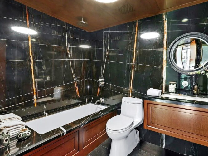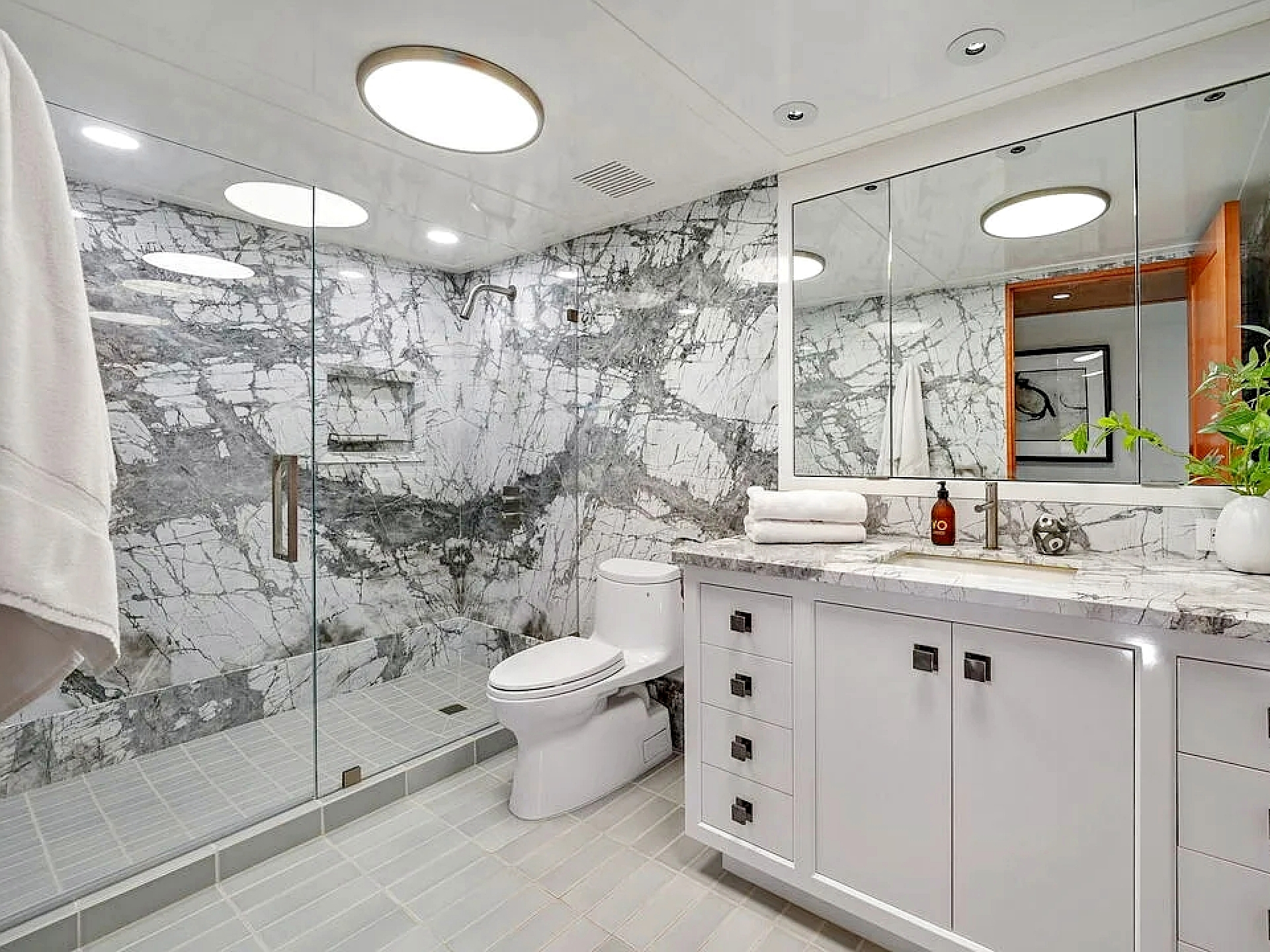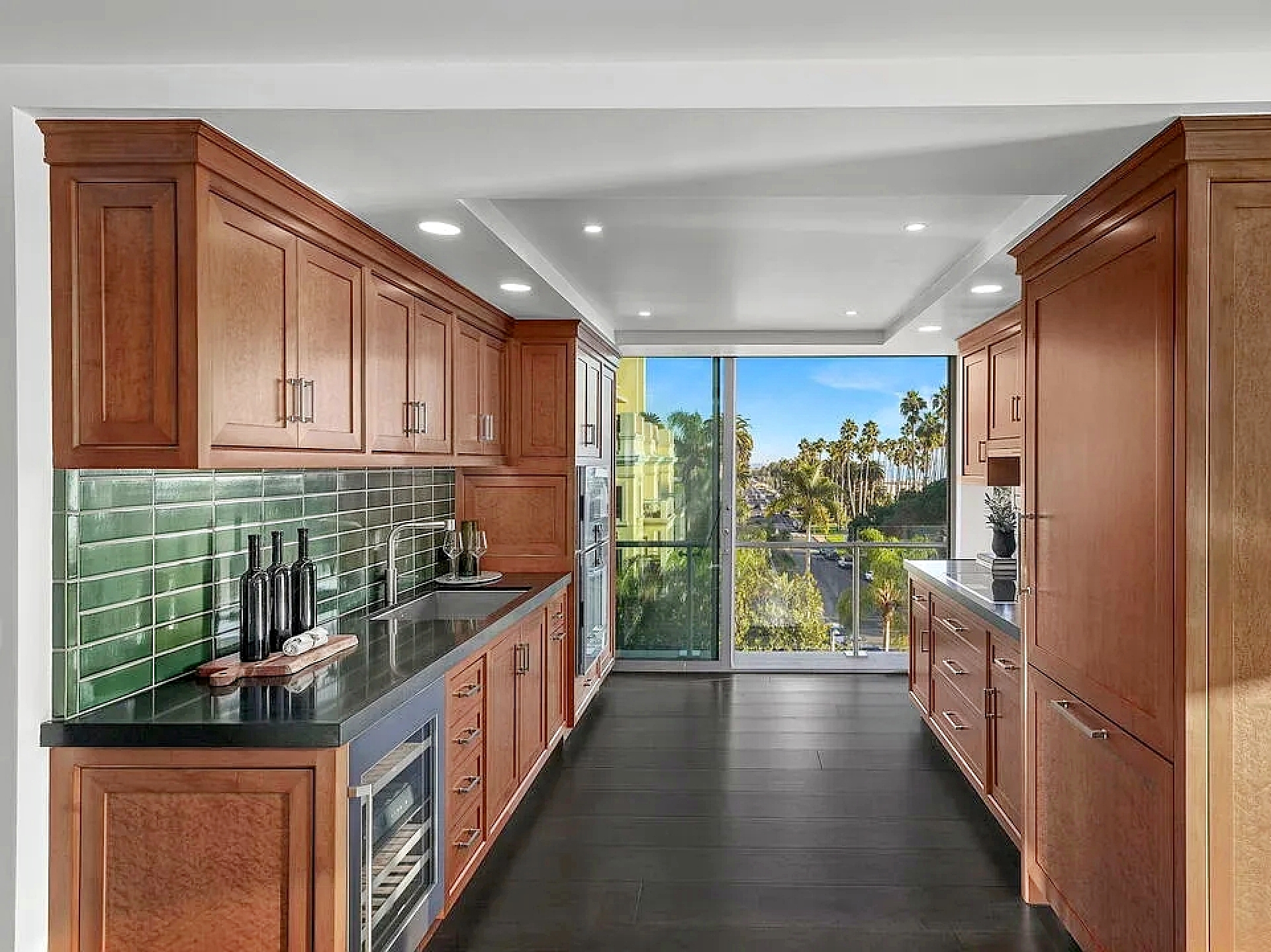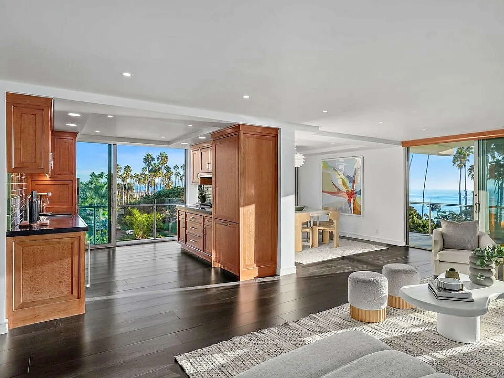 Spanning approximately 1,781 square feet, the expansive open floor plan is framed by walls of glass and floor-to-ceiling sliding doors that open to a dramatic wraparound balcony overlooking the Pacific. Designed with elevated materials and meticulous craftsmanship, the interior features European oak flooring, Birdseye maple cabinetry, custom lighting, and designer marble-lined bathrooms.