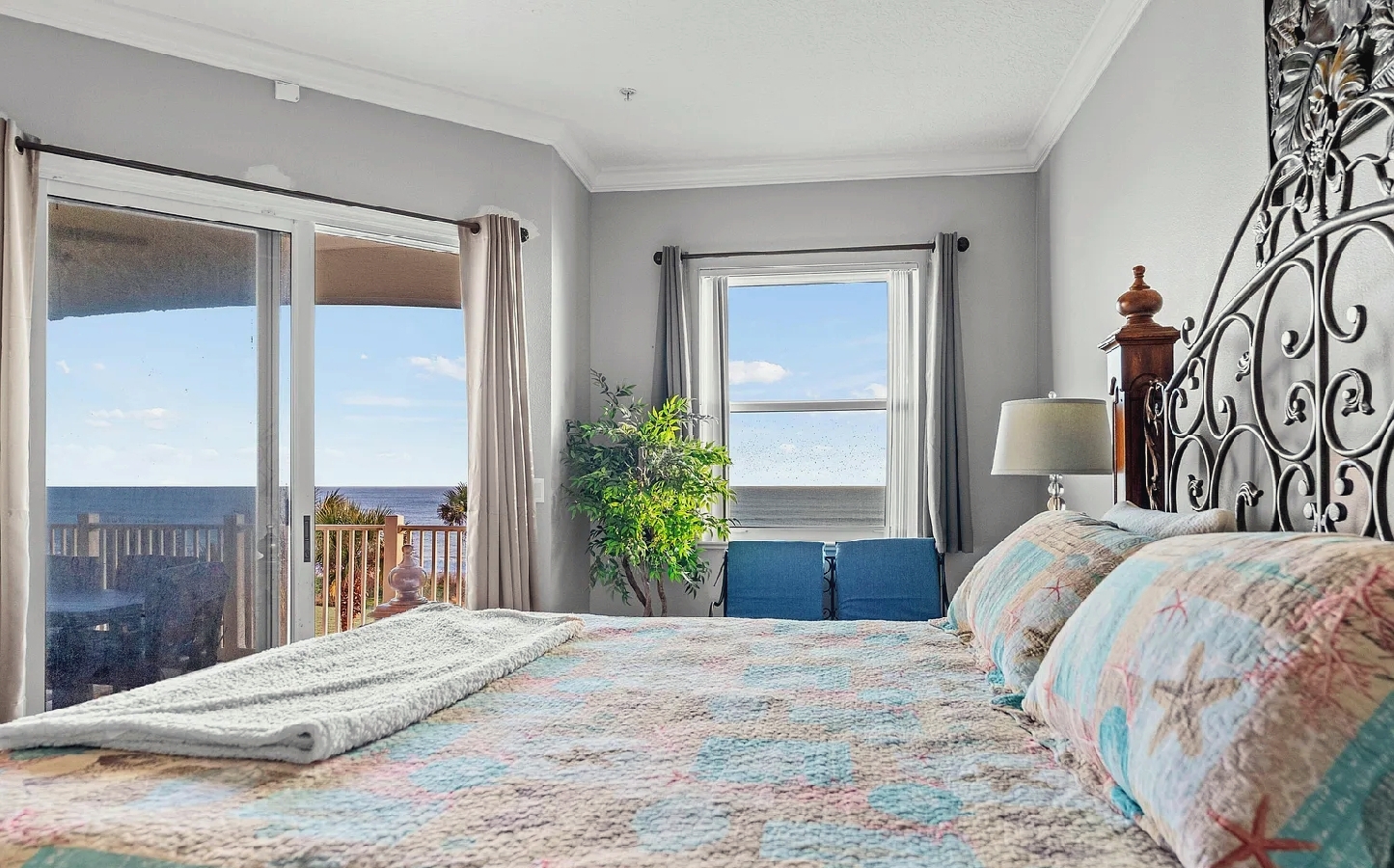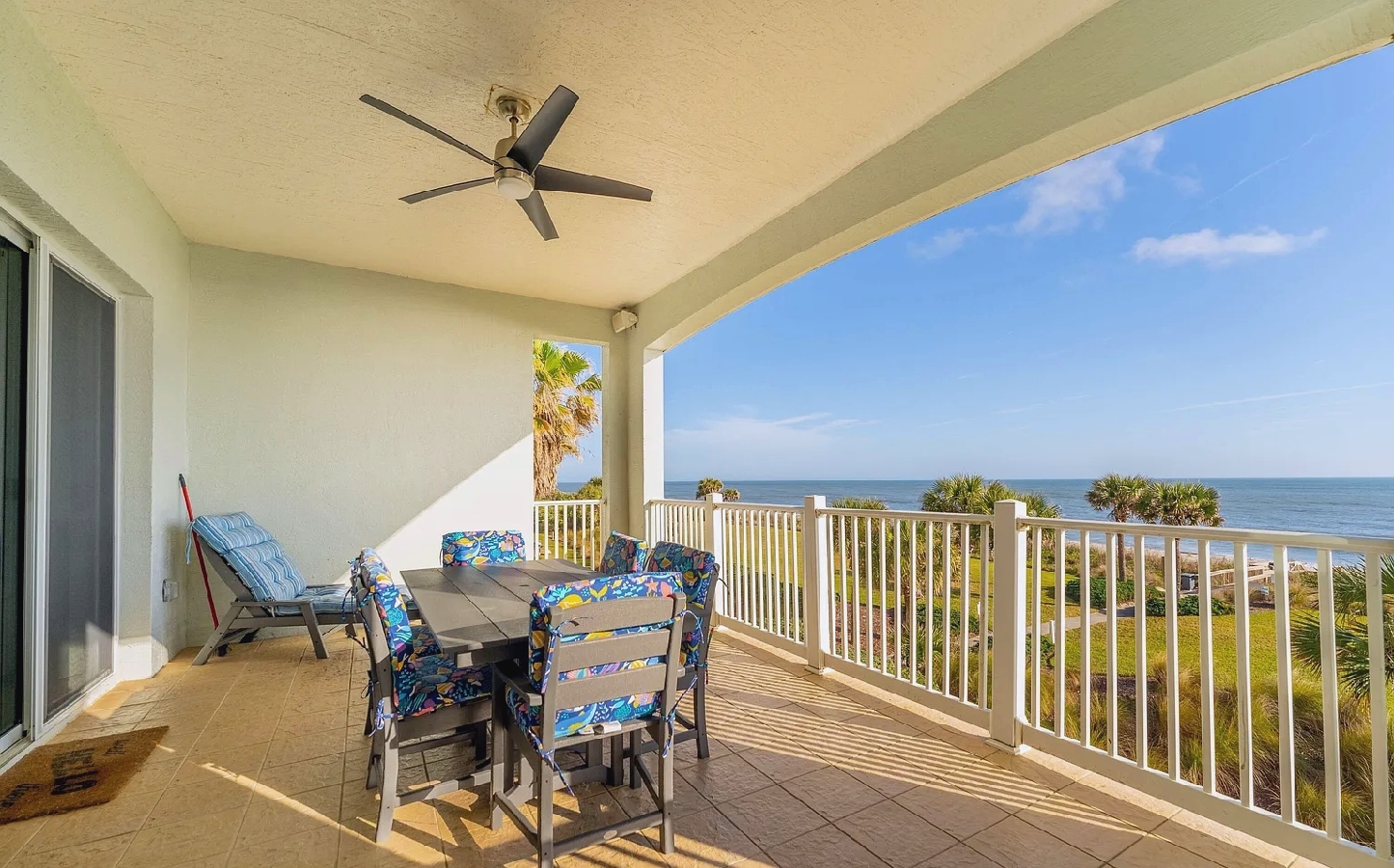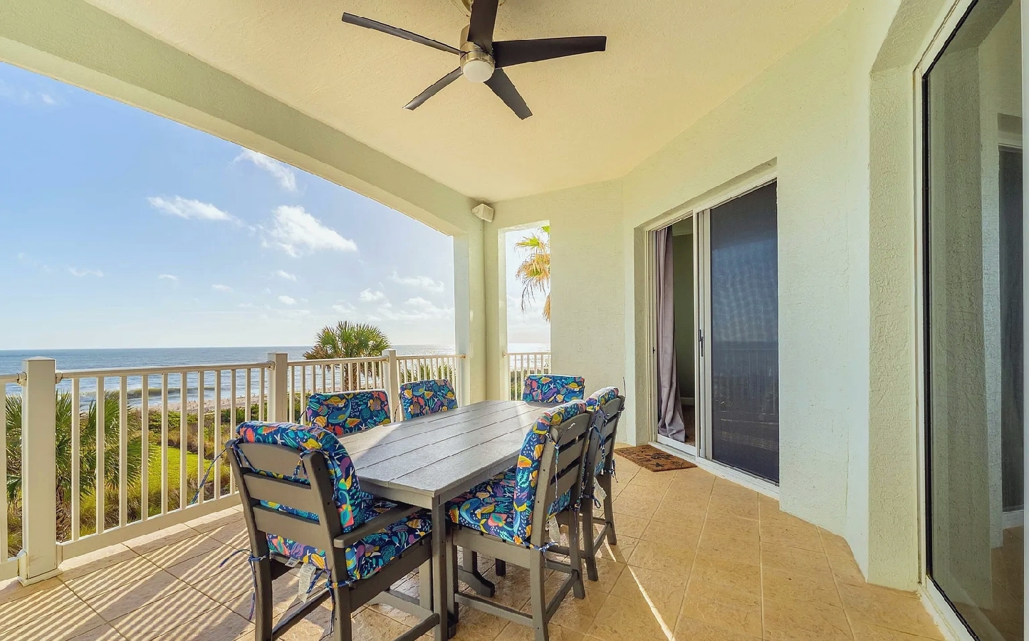 This oceanfront three-bedroom apartment offers sweeping views of the Atlantic and a serene coastal atmosphere ideal for relaxation. The open-concept layout features elegant tile flooring, a gourmet kitchen with granite countertops and stainless steel appliances, and a spacious primary suite overlooking the shoreline. An expansive private balcony provides the perfect place to enjoy sunrise coffees or evening breezes just steps from the sand. Guests can take advantage of resort-style amenities including two heated pools, a fitness center, clubhouse, game room, and direct beach access. Perfect for families or couples seeking a luxurious yet comfortable seaside retreat close to dining, golf, and outdoor attractions in beautiful Palm Coast.