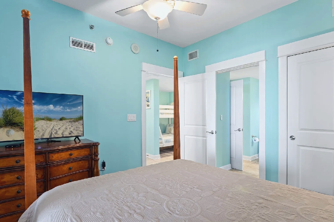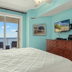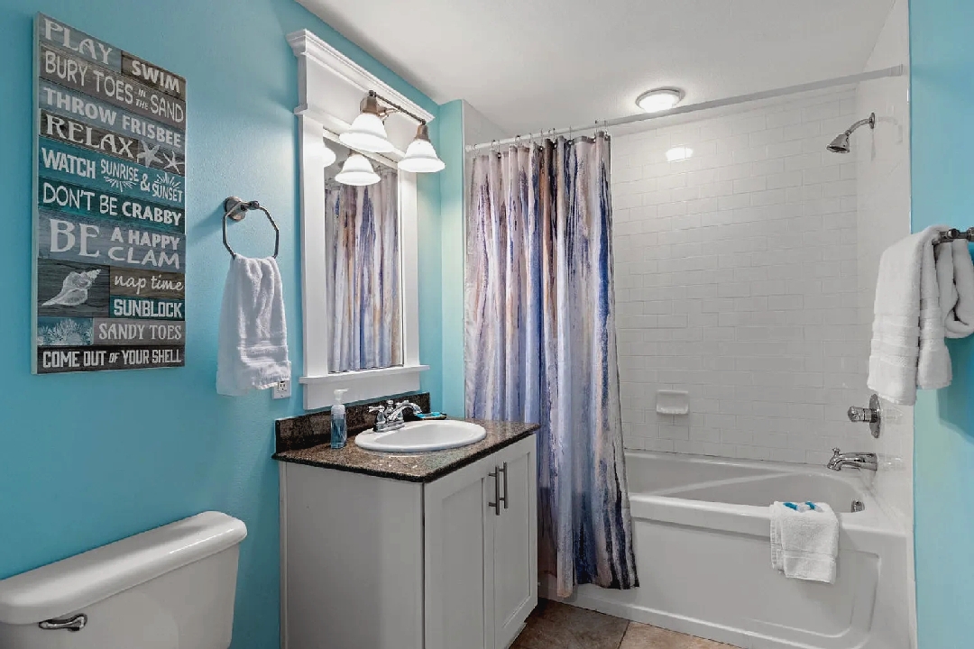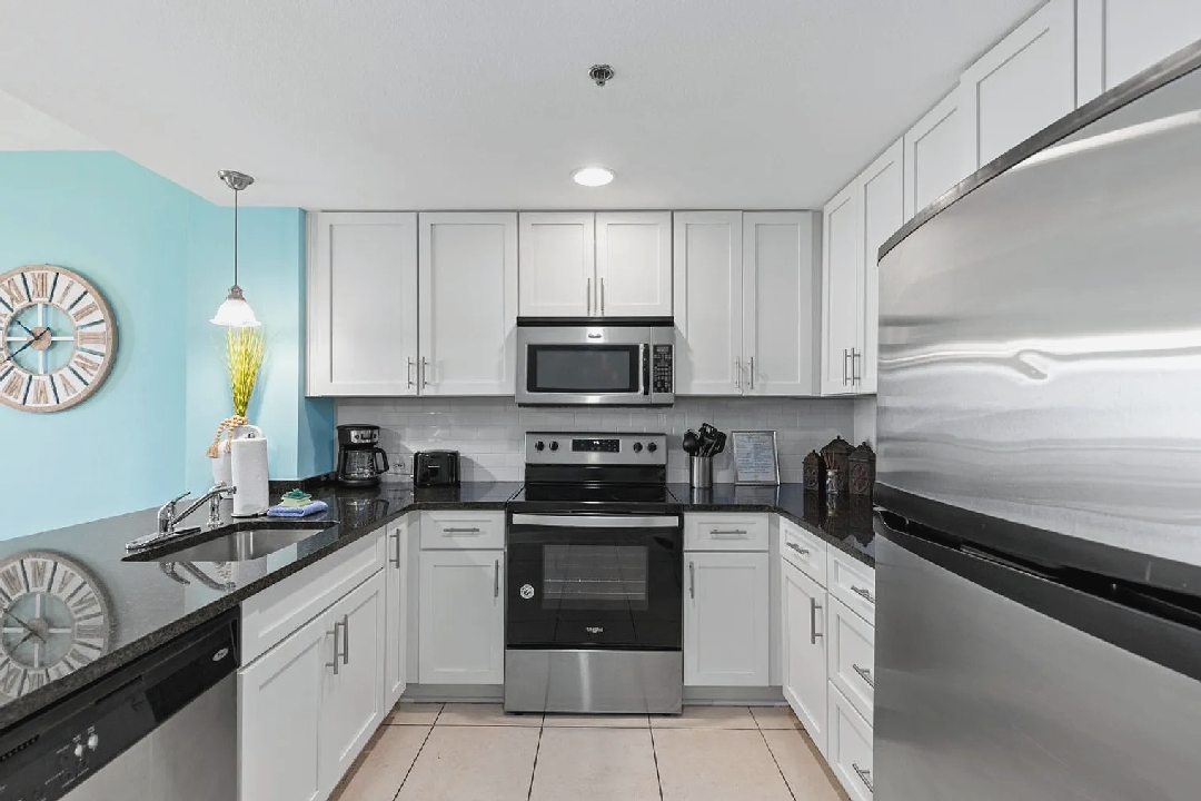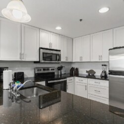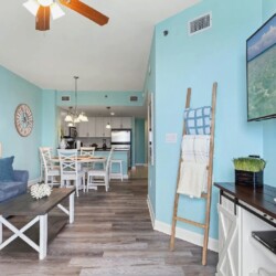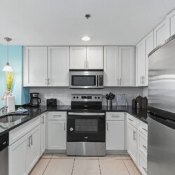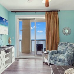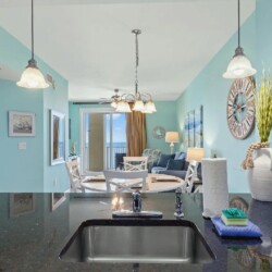 Bright open living areas with comfortable furnishings, a fully equipped modern kitchen, and wide windows framing sweeping Gulf views create an inviting beachfront setting; guests can step directly onto the sand and enjoy convenient access to nearby dining, shops, and local attractions, making it an ideal retreat for families or groups seeking a memorable Panama City Beach getaway.