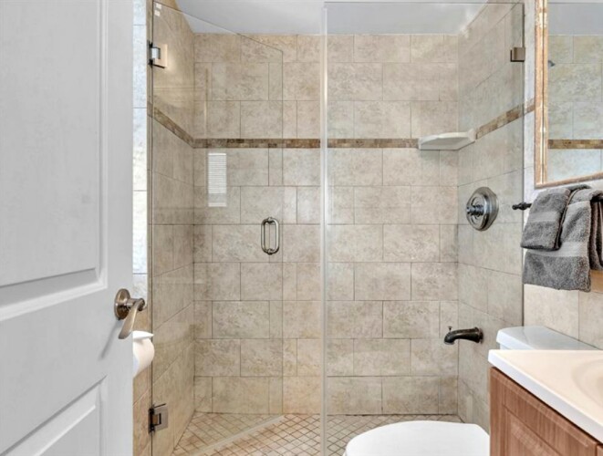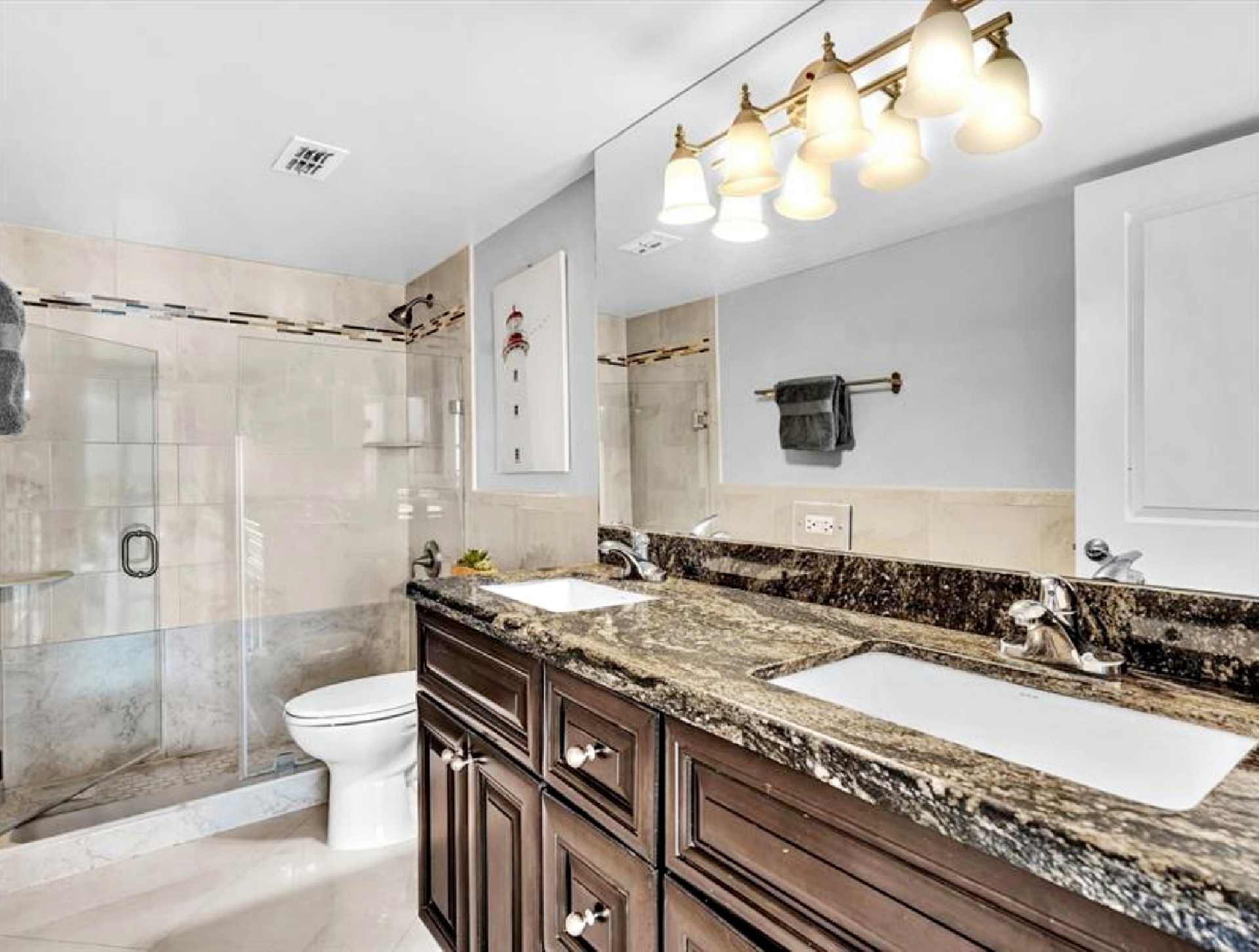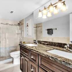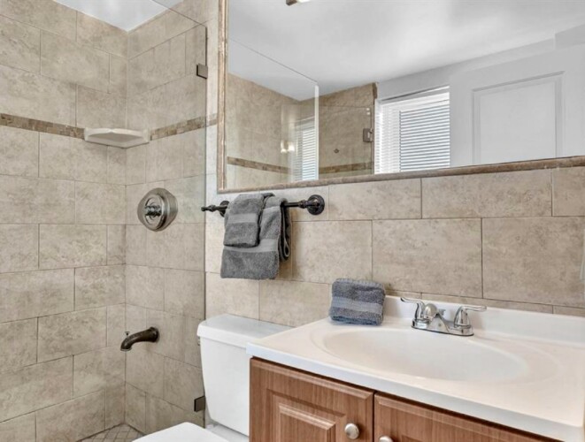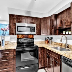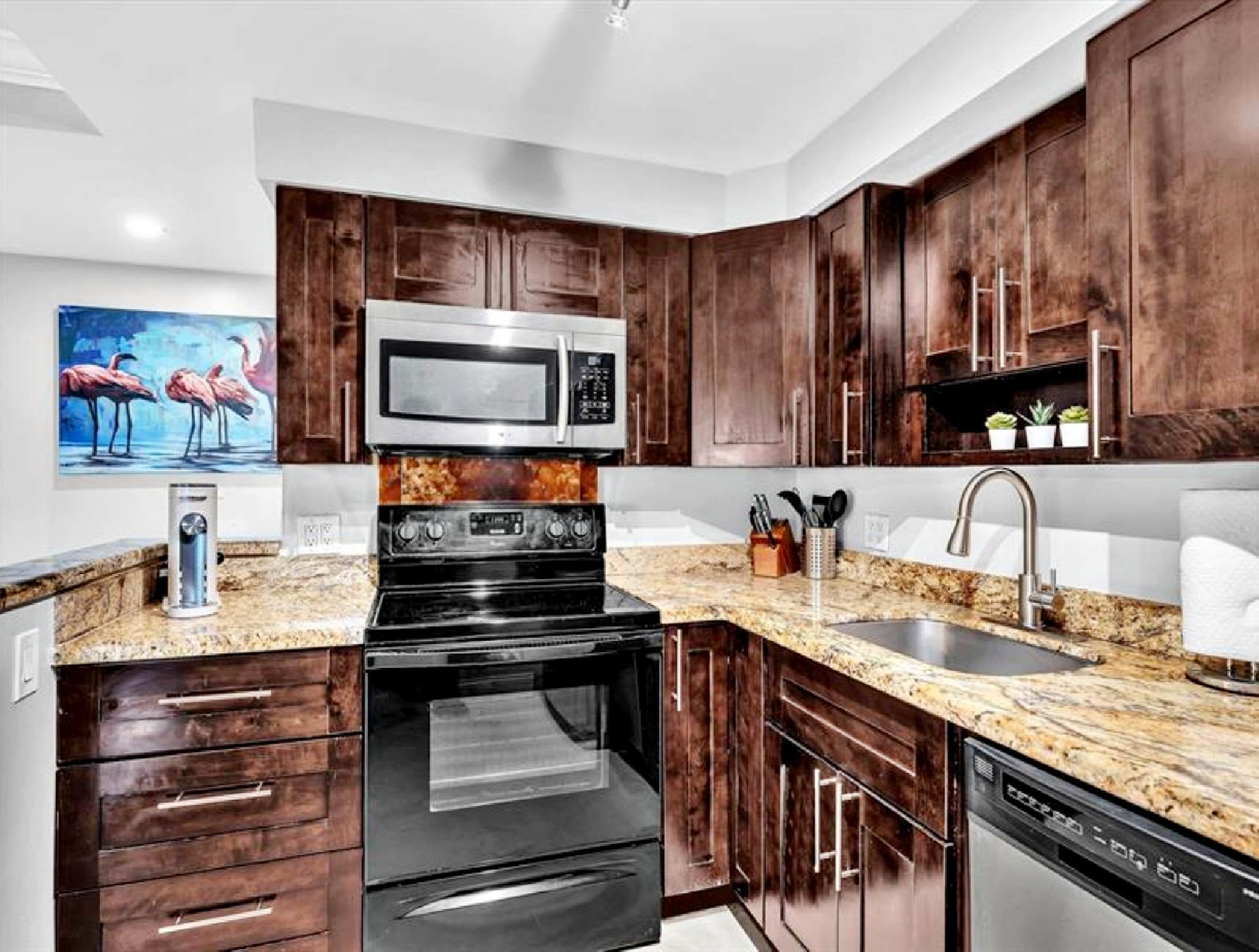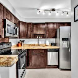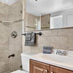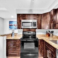 The fully equipped kitchen supports everyday convenience, while the thoughtfully arranged layout provides privacy between the two bedrooms. Two full bathrooms enhance comfort for families or small groups, and in-unit laundry adds practical ease for longer visits.